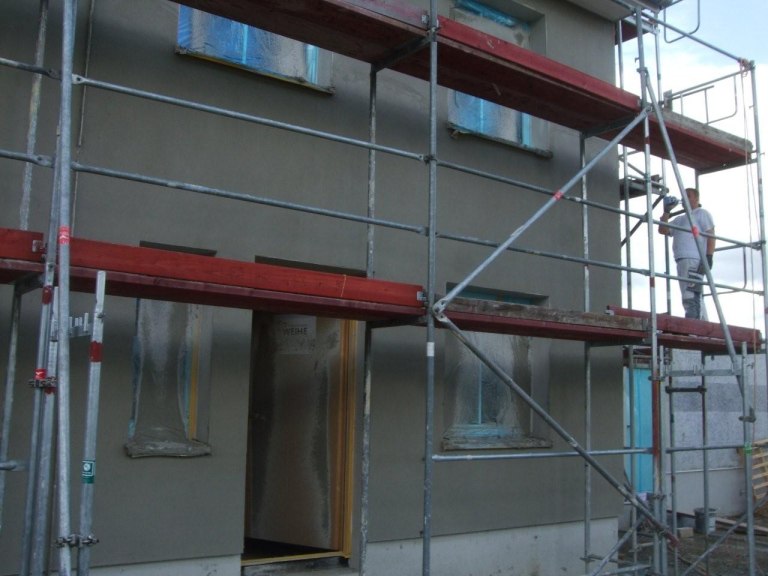 Und auch bei der ersten Zeile war gestern was los: Der Außenputz kam drauf. Damit waren auch zu später Stunde noch acht fleißige Arbeiter beschäftigt. Innerhalb eines Tages wurden die Vorderseite und der uns zugewandte Giebel verputzt. Also rund die Hälfte der gesamten Fläche (etwas weniger, denn der Heizungsraum muss ja auch noch verputzt werden).